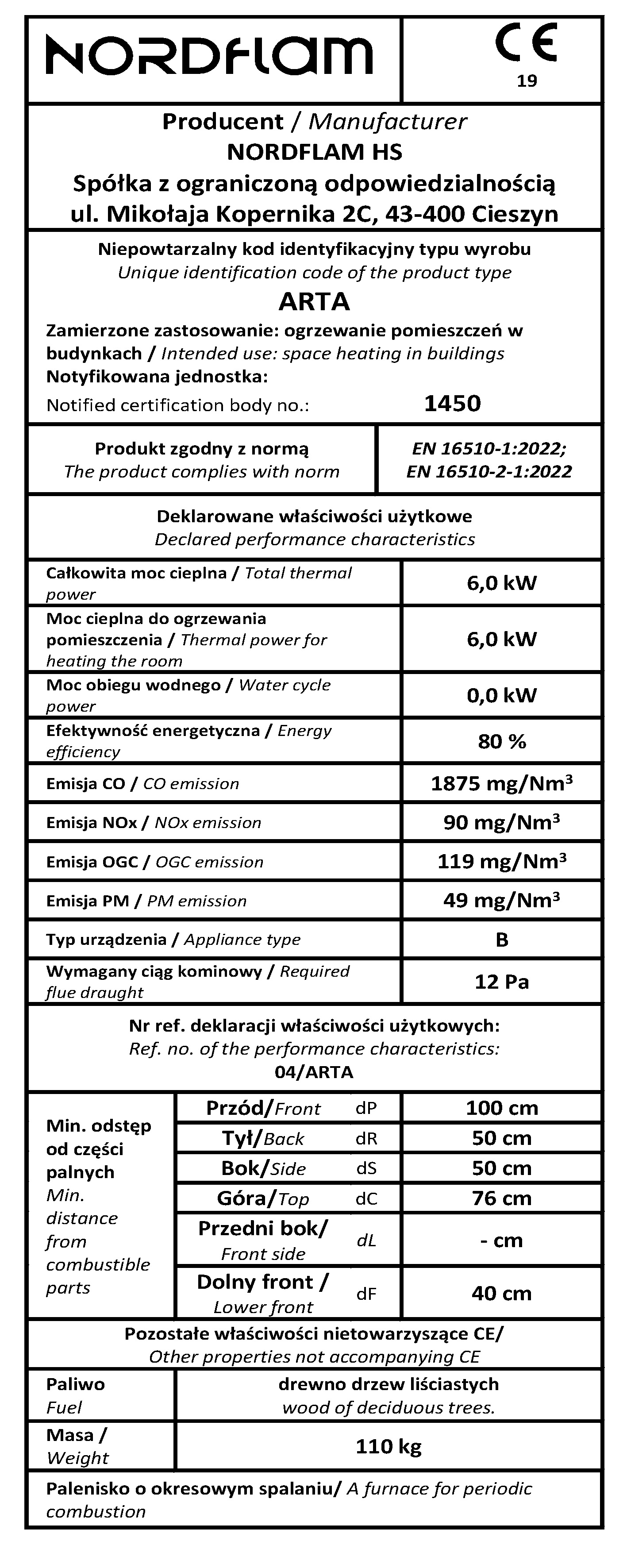deklaracja właściwości użytkowych i zgodności instrukcja obsługi informacja techniczna karta produktu klasa energetyczna tabliczka znamionowa rysunek techniczny